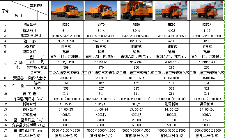 MK50兩軸礦用車(chē)以公司MK70平臺(tái)打造,國(guó)內(nèi)市場(chǎng)首創(chuàng),填補(bǔ)該類(lèi)礦用車(chē)產(chǎn)品市場(chǎng)的空白。采用行業(yè)內(nèi)得到廣泛認(rèn)可的玉柴發(fā)動(dòng)機(jī)、法士特變速箱、車(chē)橋承載系統(tǒng)及舒適豪華的駕駛室??捎糜谝苯鸬V山、露天煤礦與鐵礦、水利水電工地、有色金屬礦山、建筑工地等場(chǎng)所的物料運(yùn)輸設(shè)備。